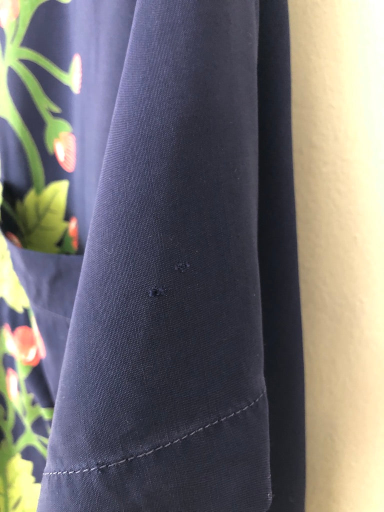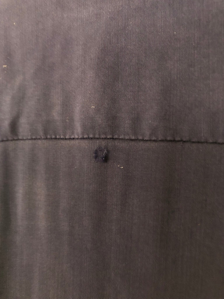 - A few small tears and small holes. Missing bottom button. Couple of seams coming undone. In good vintage condition.