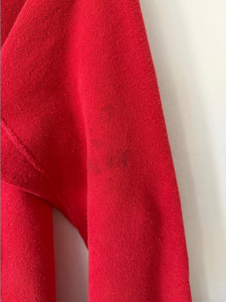 - Unusual ripping in small circular area on front. Couple of other tiny holes. Some staining throughout. Material still has a good thick feel. In good vintage condition.