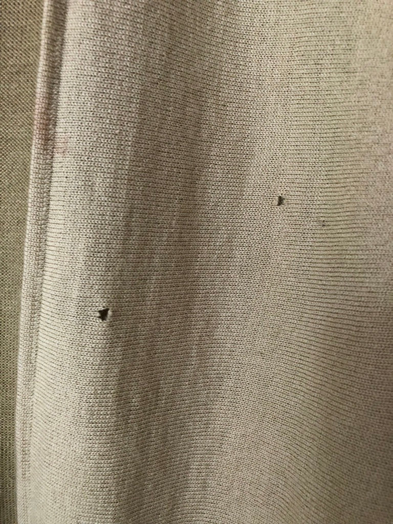 - Holes throughout. Pilling around underarms. In good vintage condition.